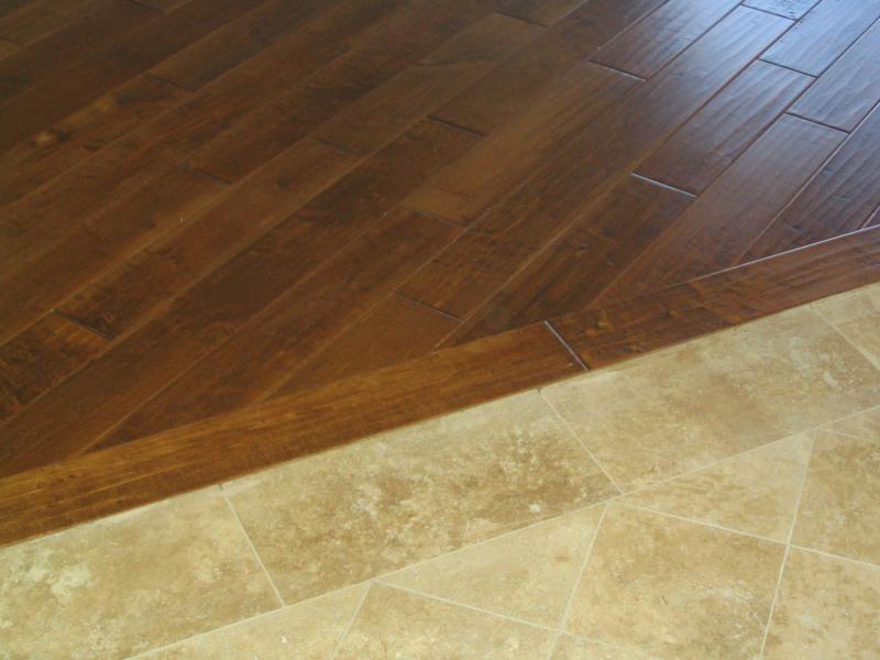 We use high quality leveling underlayment products. These products are applied to repair, smooth and level concrete. This is especially noticeable when butting hardwood to tile. This is an example of our ability to utilize these products to make the transition from a hardwood room to a tile room very sleek!